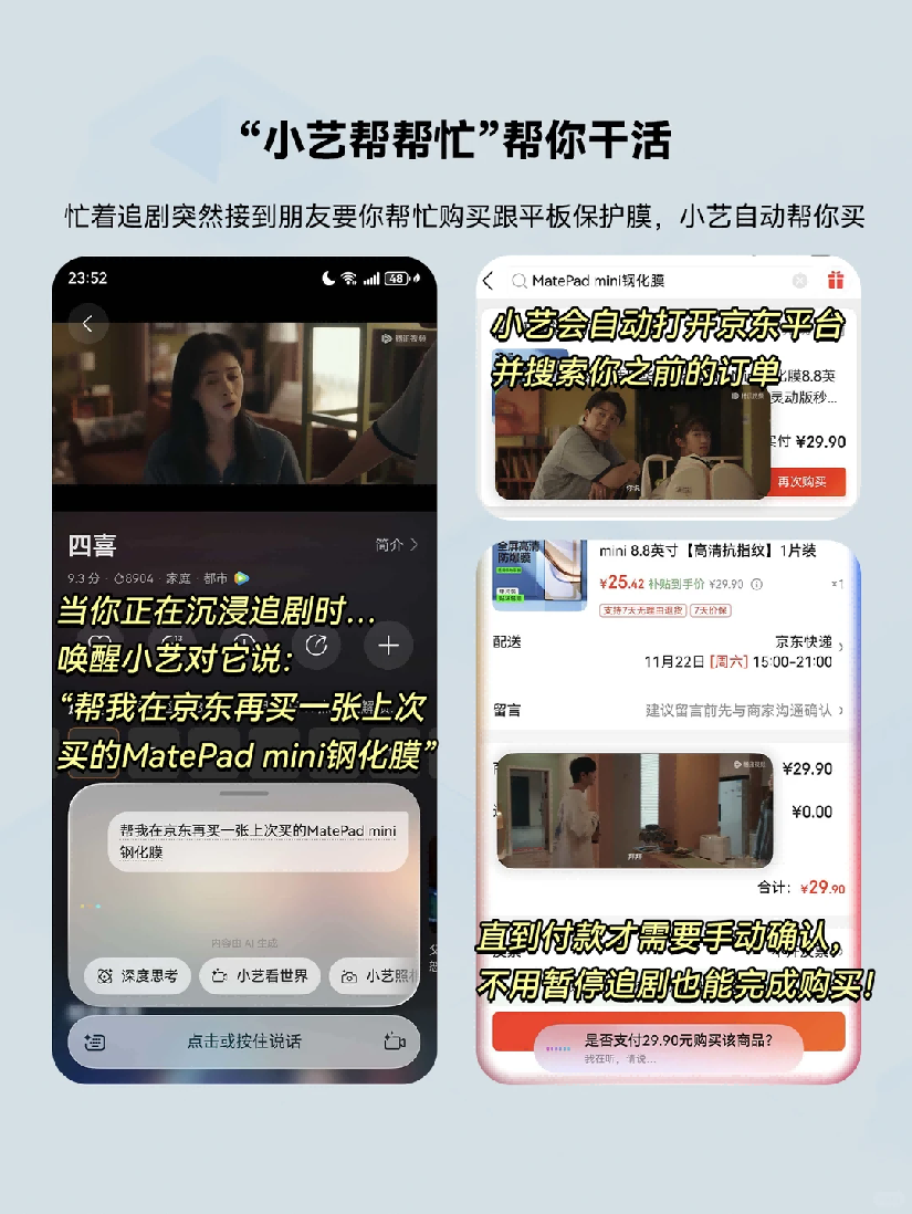 在单设备任务处理上,HarmonyOS 6的AI能力也让工作效率实现质变。之前我需要重复买办公耗材,通常需要:打开电商平台—我的—订单查询—找到订单—再来一单,步骤十分繁琐。但小艺在升级后,只需一句“帮我在京东再买一张上次的钢化膜”,小艺就能自动调取电商平台的历史订单信息、放进购物车并下单,直到最后付款才需要我确认。