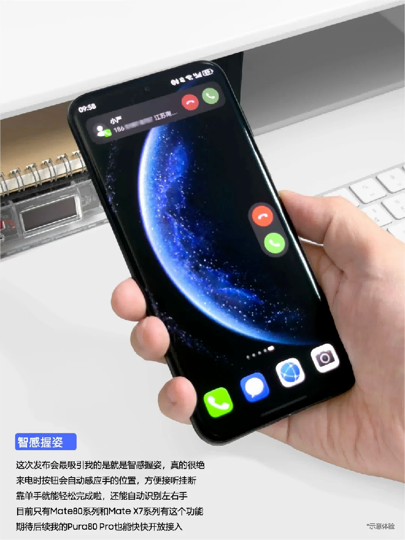 更令人惊喜的是,HarmonyOS 6还带来了“AI智感握姿”,手机能智能识别你是左手还是右手握持手机。比如来电时,接听和挂断按钮会自动出现在拇指最容易够到的那一侧屏幕边缘,再也不用费力跨屏点击。这种“看不见却用得着”的细节,正是鸿蒙AI智慧体验的精髓:不打扰你,但始终为你考虑。