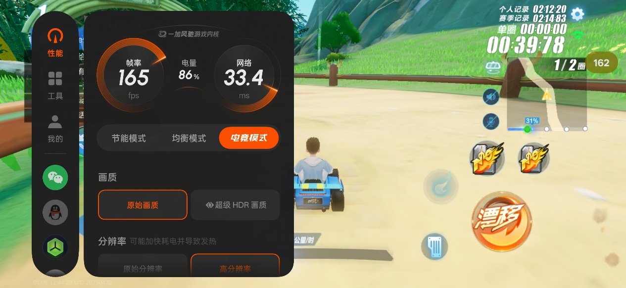进入游戏实测环节,开启高性能模式《QQ飞车》165帧高画质模式下,连续半小时游戏帧率波动不超过3%,平均帧率164几乎满帧,整个游戏全程轻松极速过弯,丝滑连漂,画面超流畅,体验更沉浸。