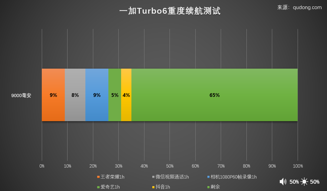 模拟日常使用场景,五小时续航测试,《王者荣耀》游戏、相机1080P60帧录像、微信视频通话、抖音、爱奇艺各一小时,最后电池仍有65%左右的电量,一加Turbo 6的续航能力完全能支撑三天的正常使用。