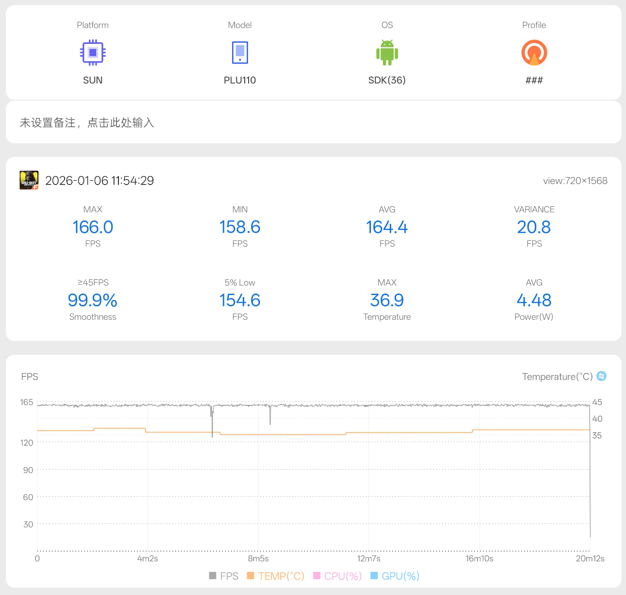 实测《使命召唤手游》原生 165 超高帧模式,平均帧率高达 164.4 帧,整机最高温度也只有37.5摄氏度。