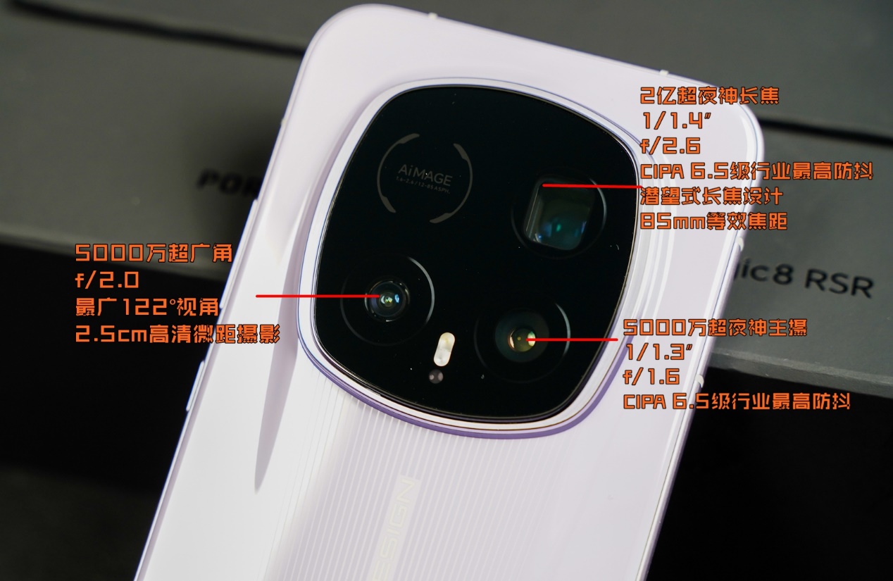 作为荣耀 Magic8 系列的顶配版本,影像系统是另一处爆点。荣耀 Magic8 RSR 保时捷设计其搭载的荣耀超夜神影像系统,沿袭了 Magic8 系列备受好评的“2 亿超夜神长焦”方案,再加上5000 万像素超大底主摄、5000 万像素超广角。配合行业最高CIPA 6.5级防抖,夜景、人像、抓拍三大场景优势明显。