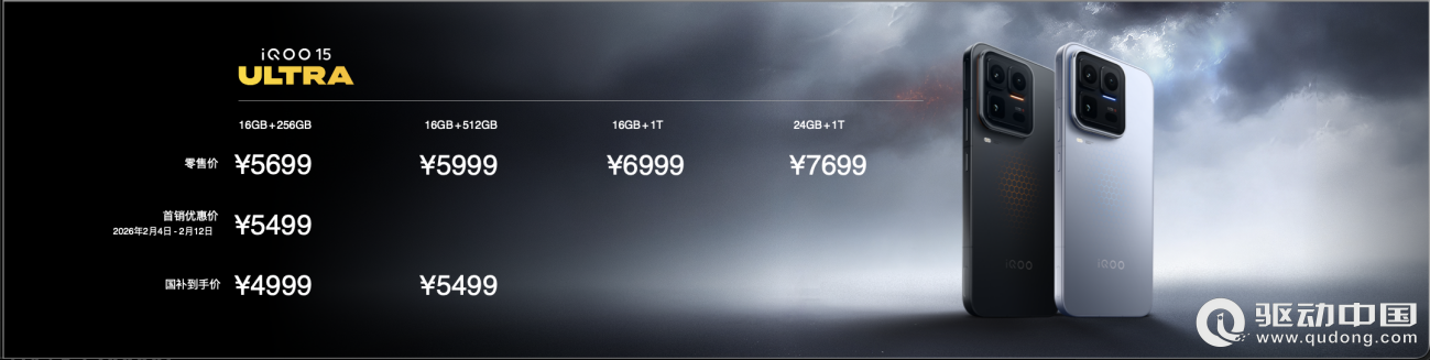iQOO 15 Ultra 共有 4 个版本可供选择,16GB+256GB 版本首销优惠价 5499 元( 2 月 4 日-2 月 12 日);16GB+512GB 版本零售价 5999 元,两个版本均能再享受至高 500 元的国补优惠。还有 16GB+1TB 版本售价 6999 元;24GB+1TB 版本售价 7699 元可选。所有购买用户尊享至高 24 期分期免息、五年风扇宝,以旧换新享大额补贴等丰厚权益。
