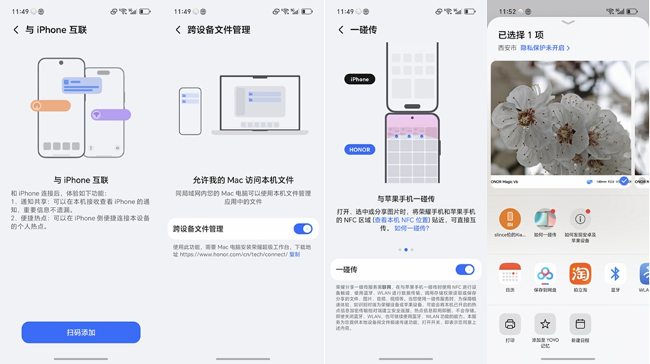 跨生态互联能力,荣耀Magic V6支持苹果全家桶智联,包括Mac扩展屏与iPhone互传功能 。对于同时使用苹果和安卓设备的用户而言,这意味着文件传输、屏幕扩展不再受品牌壁垒限制。同时支持多品牌设备互传,进一步增强了跨设备协同能力 。