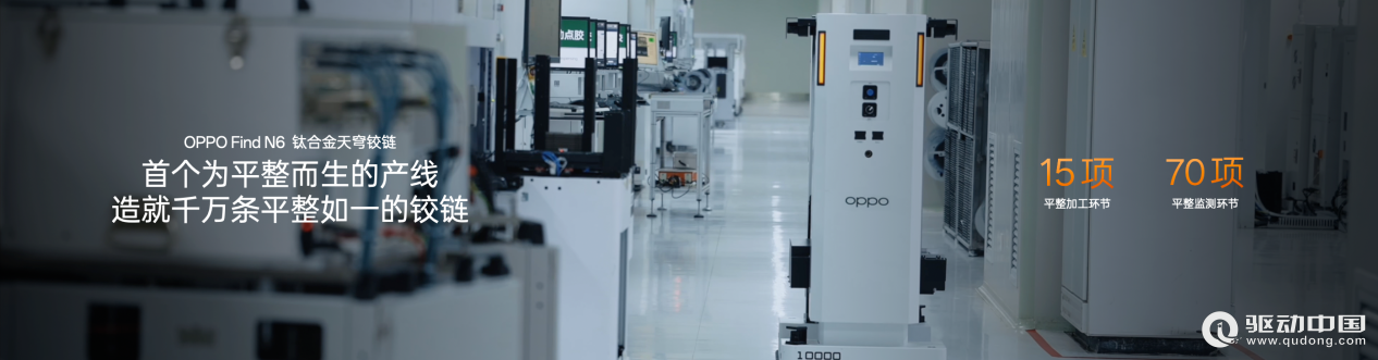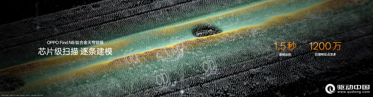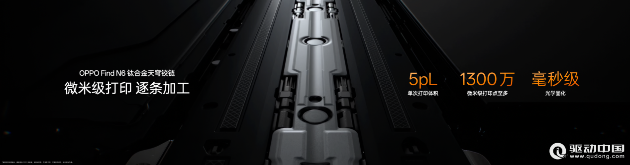 「新一代钛合金天穹铰链」,率先打破传统精密加工的极限。铰链采用行业首个仿生对称四轴结构,相较传统三轴铰链,扭力提升 20% 的同时,让铰链表面起伏从 0.18 mm 降至 0.1 mm,支撑面更广、受力更均匀,开合手感丝滑如一。但 0.1 mm 的起伏依然不够,OPPO 追求的是极致的平整。为此,OPPO 开创性地将芯片领域的精密加工技术应用于铰链制造,带来行业首创「芯片级高分子 3D 打印技术」,让铰链中板平整度至高提升 75% ,将微观天堑化为坦途。OPPO 更打造了行业首个专为平整而生的产线,让每一台 Find N6 的铰链都拥有极致统一的平整表现。
