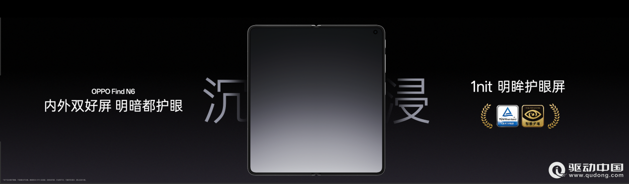 屏幕素质方面,OPPO Find N6 延续 OPPO 在显示领域的绝对领先优势,内外双屏均搭载 1nit 明眸护眼屏,暗光下显示均匀清晰,告别抹布屏困扰;内外屏全局峰值亮度提升至 1800nits,烈日强光下依然清晰可见。同时,这块屏幕更通过了德国莱茵 TÜV「金标」护眼认证,提供「亮光看得清,暗光更护眼」的全场景舒适体验。
