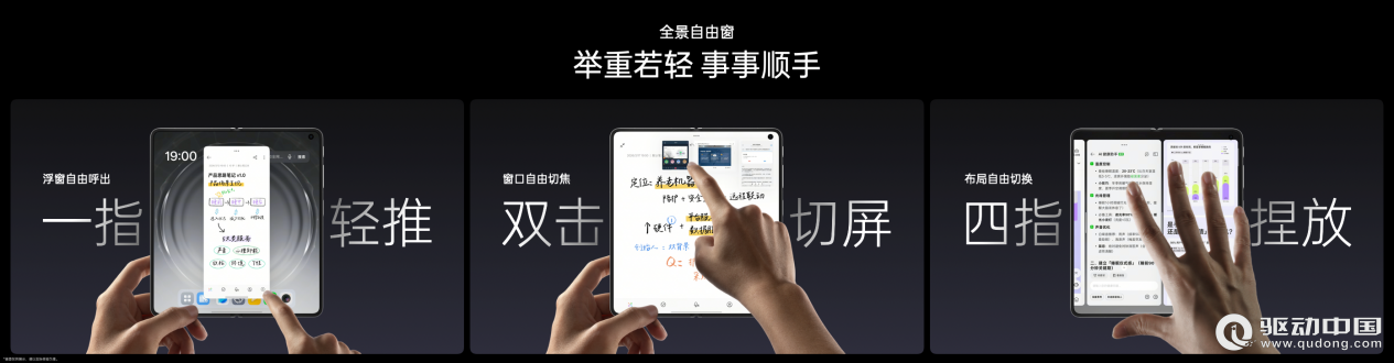 OPPO Find N6 更带来全面升级的全景自由窗分屏方案,彻底打破传统分屏的僵硬边界,实现了超越 PC 级的多窗口自由体验。用户只需一根手指,从边角向内轻推即可将应用从全屏变为浮窗,一推一拉就能无极调节窗口大小与比例;四指捏放即可在分屏与浮窗布局之间秒切,真正实现轻松拿捏多任务。全景自由窗最多支持 4 个应用窗口同时开启,可自由平铺、堆叠、悬挂,投资看盘、会议办公、合同对照等场景都能找到最顺手的布局解法。