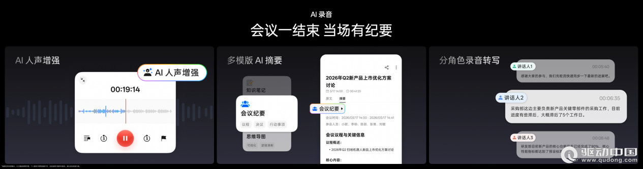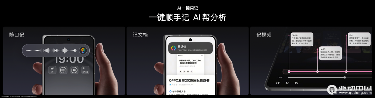 依托强大的 AI 能力,OPPO Find N6 还首次搭载系统级多功能快捷键,带来「AI 一键闪记」功能,一键即可完成语音灵感记录、文档资讯摘要、视频关键信息提取;AI 录音功能可精准区分发言人,生成多模板智能会议纪要,真正实现「录音两小时,回顾五分钟」的高效体验。