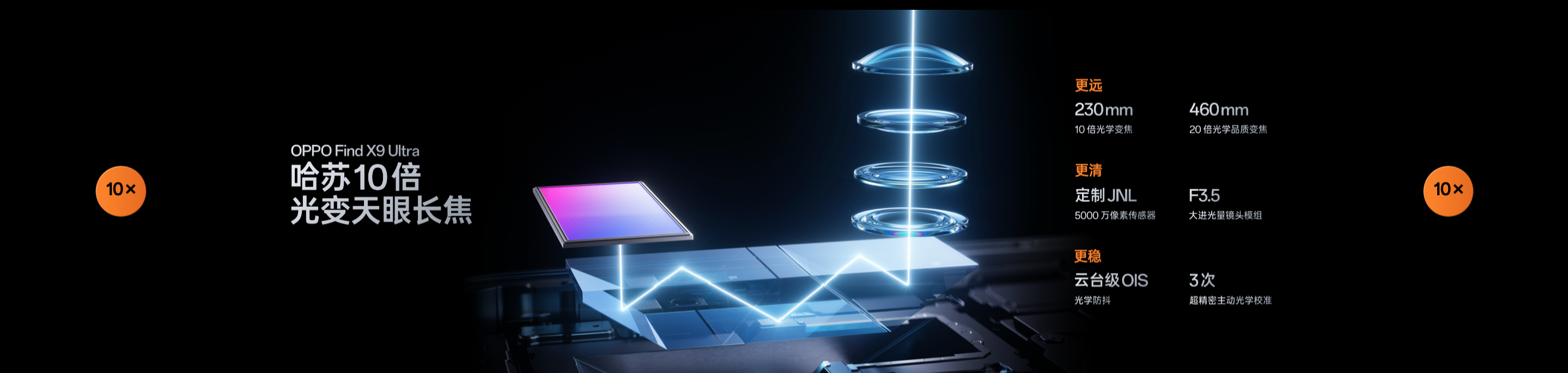 Find X9 Ultra 搭载哈苏 10 倍光变天眼长焦,实现行业首个 20 倍光学品质变焦。为此,OPPO 首创五反射潜望棱镜和全新空气光阑技术,五反射潜望棱镜让光线在内部实现五次反射转向,将棱镜长度缩减了近三分之一,空气光阑技术则通过在棱镜中加入空气层,利用玻璃与空气的介质差过滤杂光,进而得到纯净光线。两项创新技术的加持,真正实现了无需增距镜,远景依然触手可及。